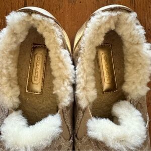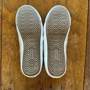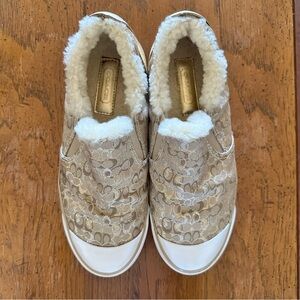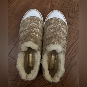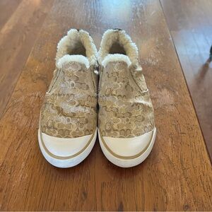 COACH Gold Slip-On Lined Sneakers. Shoes are in good condition. Outer soles are somewhat dirty. Size tag has been cut out. Shoes measure approximately 11” from toe to heel on outside and approximately 9.5” on the inside. See pics.