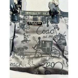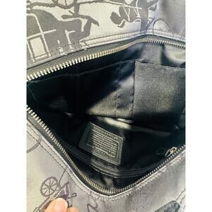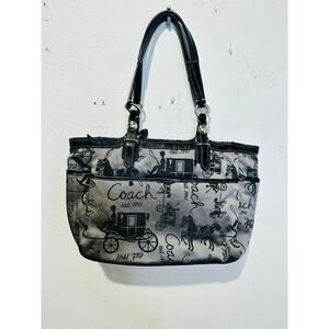 COACH Grey Black Horse Stagecoach Carriage Printed Fabric Y2K Leather Tote Handbag Purse