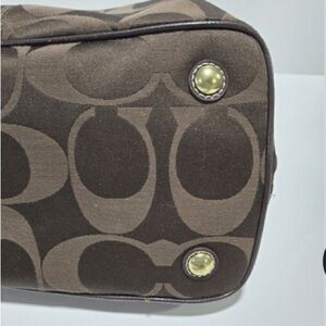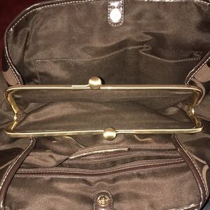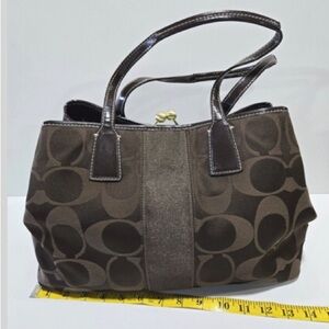 This COACH Signature Framed Kisslock Stripe Shoulder Bag Purse in Brown is a stylish addition to your collection. The bag features a striped pattern and a snap closure. It has a medium size with a width of 14 inches, a height of 10 inches, and a depth of 6 inches. The exterior is made of canvas and patent leather, and it comes in a beautiful brown color.