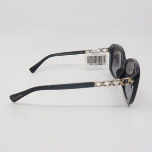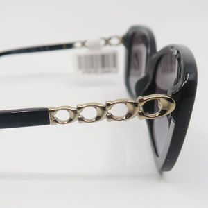 COACH HC8286 5002/8G New Black/Gray Gradient Butterfly Sunglasses. 100% Authentic. The frame is glossy black acetate, full rim, butterfly style. The temples are gold C Coach logo and glossy black acetate, Coach logo on both tips. The lenses color is Gray, Gradient, Polycarbonate, 3N. COACH logo is engraved on left lens. Width/Bridge/Temple size is: 57mm , 17mm, 140 mm. At the moment we are out of Coach cases. The sunglasses are shipped with a generic black zipper case and microfiber cleaning cloth. Retail $173.00. C-1