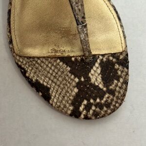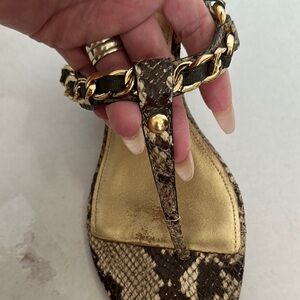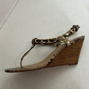 Step out in style with these elegant snake print sandals featuring chic gold accents. Perfect for any occasion, these sandals offer both comfort and sophistication. Coach “Honora” Python Thong/Wedge Sandal Gold Chain Hardware Size 8.5 M Pre Owned. WITHOUT BOX EUC