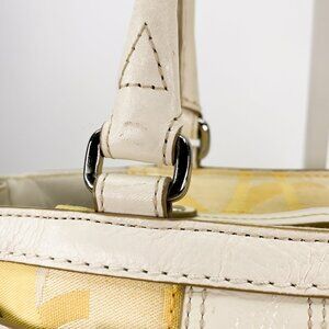 CONDITION: USED / Pre-owned in very good condition. The outer yellow canvas including the beige interior lining, the rounded ivory leather carry handles and the exterior corner leather and trim accents are in pristine condition.