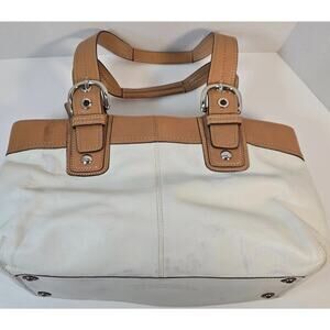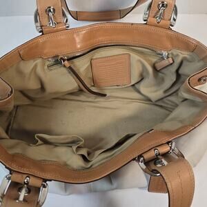 The COACH Hamptons Leather Tote in British Tan and Ivory is a stylish and spacious handbag designed for women. Crafted from leather with a solid pattern and zip closure, this large tote features brown leather handles and a beige fabric lining. The exterior color in tan complements the ivory details, creating a classic and sophisticated look. This Coach Hampton model also includes a bag charm accessory, making it a versatile and fashionable choice for everyday use.