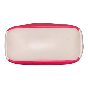 * With a trapezoid shape and pink exterior, this medium-sized bag has a cream-colored shoulder strap with a 10" drop for comfortable wear.