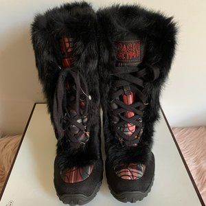 COACH JENNIE SIGNATURE "C" PLAID WITH RABBIT FUR TRIM BOOTIE BOOTS