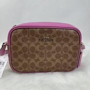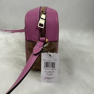 New With Tags, COACH Jamie Camera Crossbody Bag In Signature Canvas/Leather Tan/Fuchsia CZ186 from smoke and pet free environment.