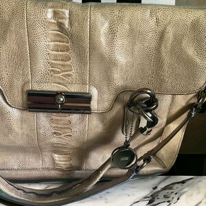 100% authentic. Limited edition 2011 tan/fawn color. Leather handles, front Kristin snap closure, Silvertone hardware, emboss ostrich elevated leather , front pocket, under flap, burgundy/purple lining, inside zip pocket, 2 interior slip pockets, removable strap, COACH CREED E1120-12822. Measures 15 1/2 “ across x 11” high x 4” wide. 5 1/2 “ hand & 9 1/2” shoulder clearance. Brand new! Retails for $1000.