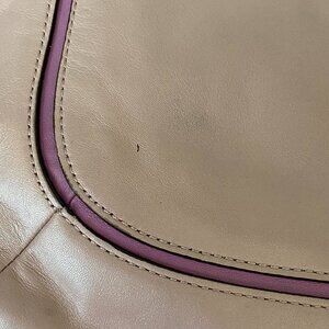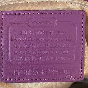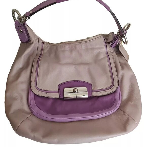Coach brand Kristin Spectator leather hobo bag. Used and has some discoloration and scuffs in the leather. Pictures above. Otherwise, in good condition. Bag is approx. 10" tall, 13" wide, and includes 37" removeable strap. Care instructions included.