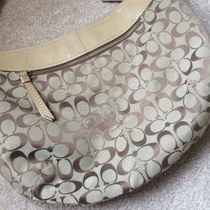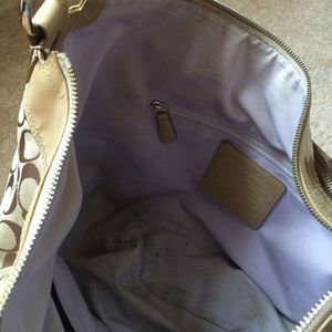 COACH Khaki Signature Brown Leather Trim Stitched Soho Hobo Bag. Has some wear and tear (shown in pictures). Great bag to carry a lot around.
