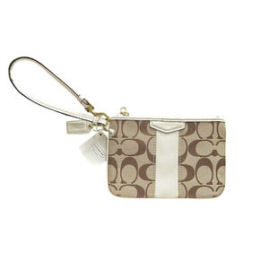 COACH Light Khaki/Ivory Signature C Canvas Leather Trim Zip Wristlet Bag. Top Zip Closure. Wrist Strap. Iconic COACH Hang Tag 6.5" x 4". Gold Hardware. Embossed Logo. Made in Philippines. Brand New with Tags (Originally $58). Ships within 24 hours.