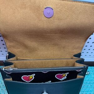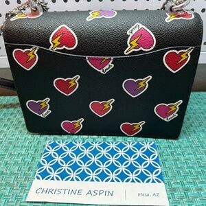 This is a COACH Klare Crossbody/Shoulder bag in a mix of coated canvas and smooth leather with an adorable heart print. The background is black, and the hearts are red, pink, and purple with little yellow lightning bolts. Hardware is silver. Adjustable chain straps with leather shoulder piece can be extended for crossbody wear, or doubled for shoulder carry.