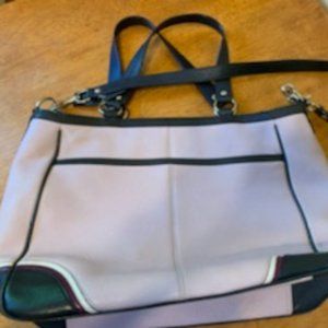 Color: Violet/Navy Trim · Leather Trimmed In Navy/Violet. · Zip Top Closure With Leather Pull Tassel. · Coach Embossed Logo Button Accents. · Nickel Polished Hardware. · Leather Coach Hang Tag. · Front Slip Pocket With Leather Pull Tassel. · Back Slip Pocket With Magnetic Snap Button. · Double Leather Handles With 8" Drop. · One Removable Adjustable Leather Strap Approximately 17" Drop. INTERIOR FEATURES: · Black Sateen Fabric Lining. · Large Zippered Pocket On The Inside. · 2 Open Multi-Function Pockets. · Leather Coach Creed On The Inside. ·