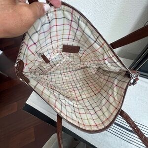 It features double leather handles in a matching brown color, designed for shoulder carry. The bag is accented with silver-tone hardware, including the handle rings and the zipper closure. The main compartment secures with a zipper closure.