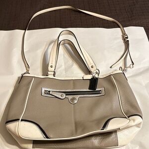 COACH LAURA SPECTATOR TOTE#F15145 ALL LEATHER PEBBLE GRAIN BAG NEUTRAL Cream BODY WITH WHITE ACCENTS . MAGNETIC SNAP ENTRIES AND SNAP CLOSURE CENTER. Very spacious. Leather Coach hang tags, very good condition
