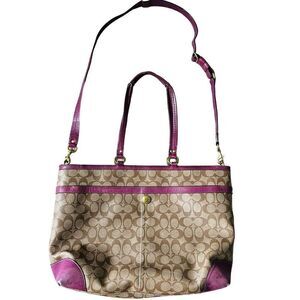 COACH LEATHER CARRYALL IN SIGNATURE CANVAS KHAKI LILAC LEATHER TOTE BAG