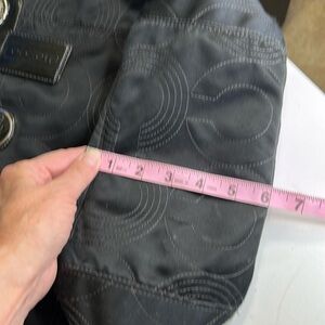 Coach leather wear black nylon double handle blue satin interior, zipper closure, coach logo tag, silver hardware double leather straps (black pattern, leather on straps is wearing off as shown in pics ) one large zip pocket inside to slip pockets other side, one large pocket on back coach logo tag check pics comment with any questions