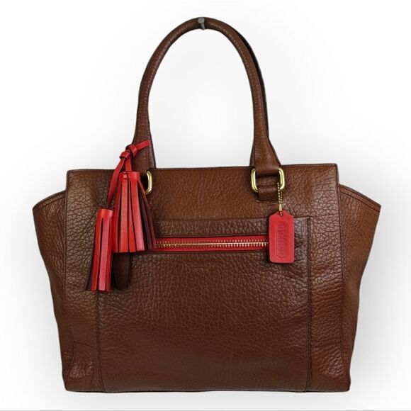 COACH LEGACY PEBBLED BROWN RED TASSELS HANDBAG PURSE TOTE