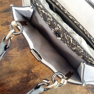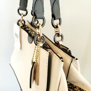 Dreamer bag from Coach in smooth leather with genuine snakeskin details featuring a zip closure, fabric lining, top handles with 5 3/4" drop, a gold toned metal hardware, side snap pockets, Signature charm and 1 main interior compartment with a zip pocket and multifunction pockets.