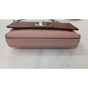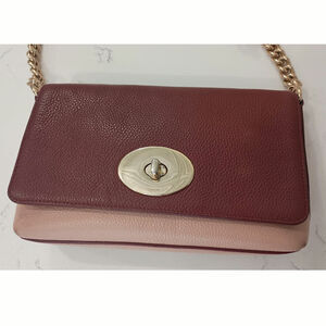 Coach minimalist crossbody authentic leather color block in burgundy and rose pink with flap TurnKey closure size 9.5 x6.5 in. Gold chain juxtaposition to leather strap. Strap is in good condition as well as the rest of the purse minor wear on bottom corner edges. Inside storage pocket. Outside keychain tag classic. Inside coach Creed. Inside condition is clean. See photos. Very regency core minimalist chic quiet luxury Coachella capsule