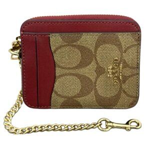 COACH Leather Zip Card Case Signature Khaki Cherry Detachable Chain NWT