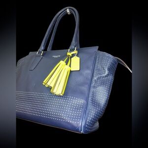 Used COACH Legacy Perforated Navy Blue & Bright Citrine Tote Shoulder Bag has a couple minor marks, in good condition, very clean, from a smoke free home