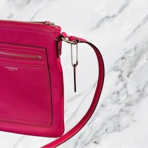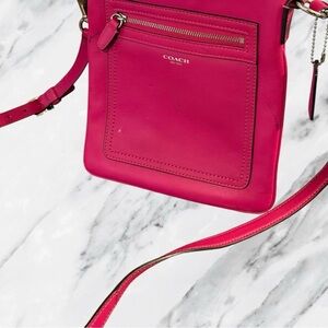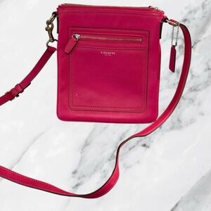 This authentic Coach Legacy Swinger Pack is a vibrant Y2K-era crossbody crafted in smooth coral pink leather. The bag features a sleek silhouette with a front zip pocket, top zip closure, and an adjustable crossbody strap for versatile wear. Inside, the light fabric lining offers a roomy main compartment perfect for carrying your essentials on the go. The original leather hangtag is intact, adding a classic Coach detail. There are visible marks, discoloration, and scuffs on the front and back of the bag as pictured, along with light wear inside, consistent with age and use. Despite these flaws, the bag remains stylish, durable, and highly functional, making it a great everyday piece or a pop of color for your collection.