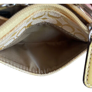COACH Lemon Yellow Signature Canvas/Patent Leather Skinny Mini ID Case Credit Card Holder Coin Purse Key Chain. 4.5"x 3". Zip Top Closure. Two Outside Slots. Attached Silver Split Key Ring. Yellow Patent Leather Pull and Trim. Brown Sateen Interior. Excellent Condition. Ships within 24 hours.