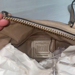 This authentic Coach purse is made of pebbled leather and features a detachable strap with 22" drop for shoulder or crossbody wear. Inside zip, cell phone and multifunction pockets. It has gold-tone hardware and is a neutral taupe shade -- perfect to wear with any outfit or color.