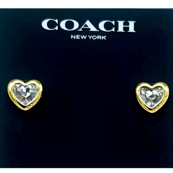 COACH Logo Crystal Heart Stud Gold-Tone Earrings with Signature Pouch NEW