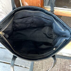 Keywords: Coach, leather tote, black tote, women's bag, spacious interior, multiple pockets, zip closure, double handles, iconic logo, casual tote, pre-owned bag.