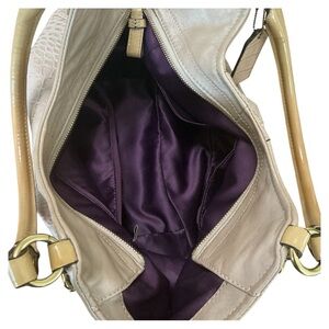This coach bag has no wear and has been gently used if at all. The inside has a burgundy satin liner with no stains, ink marks or rips. This bag is in very good to excellent condition.