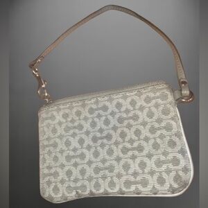 This is a gently utilized, genuine Coach needlepoint Op Art jacquard wristlet with Leather Trim. It has a zip-top closure and an adjustable leather strap. It has 2