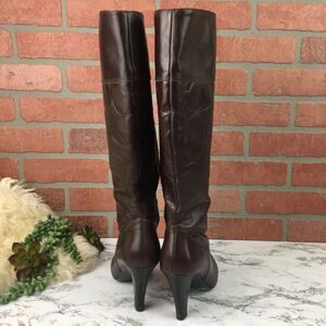 Beautiful brown leather boots. Signature embossed COACH logo all over. Size 8. Heel height is 3.5". Calf width is 7". Bottom of heel to top of boots is 18". Bottoms show some sign of wear but they are in very good condition.