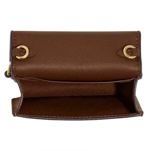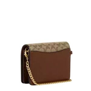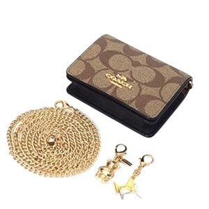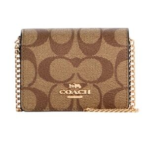 Darling Coach mini wallet on a gold chain in signature brown coated canvas and smooth black leather - NWT. Two credit card slots. Snap closure. Fabric lining. Outside open pocket (on back). Detachable gold chain with 23 1/4 " drop for shoulder or crossbody wear. MSRP - $128