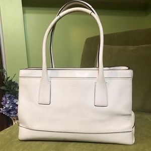 Lavender color interior. Zipper pocket & interior pouches. Hangtag attached.