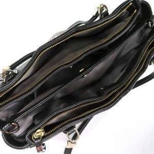 Retro 2014 shoulder bag 9” drop with adjustable, detachable crossbody strap. The bag has four separate compartments. 2 have magnetic clasps and 2 brass zippers. Soft gray lining with 2 slip and 1 zip pockets. Minor spotting on the lining shown in the last photo and also some light scuffs or minor wear on hardware and hang tag. It’s in very good preowned condition. No odors and very clean.