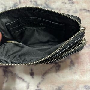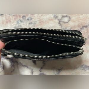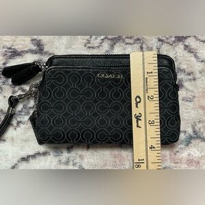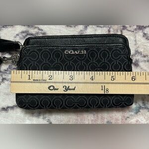 Coach double zip wristlet. Features iconic logo design. Includes wrist strap for easy carrying.