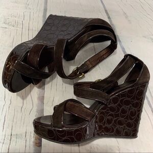 I love these strappy wedges crafted of patent leather and suede. Straps and back of heel are suede with patent leather trim. Wedge is patent leather with stitched signature c pattern. These are in excellent used condition with some wear to soles, suede, a little cracking on patent trim, and a little bit of exposed glue where strap fits into wedge. Please review pics carefully. Wedge itself is in perfect condition! Rich dark chocolate color. Priced to reflect the flaws. Adjustable gold buckles.