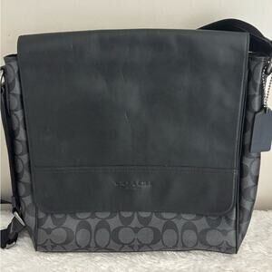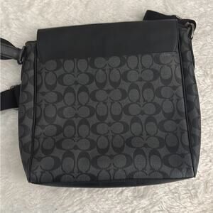 This Coach messenger bag combines a sleek black and gray design with a structured form, making it ideal for both everyday use and professional settings. Crafted from high-quality materials, it features a flap-over magnetic closure and an adjustable shoulder strap for added convenience.