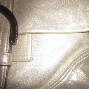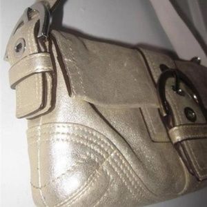 Gold suede & leather, Soho baguette purse with chrome hardware! Chunky, chrome, buckle look snap clasp and buckle accents on the sides. 2 interior compartments and pockets to keep you organized. 10"L x 3"W x 6.5"H; Strap drop: 7". Item #: 19778884. Visible wear, scuffs and scratches on surface and hardware. All measurements are approximate.
