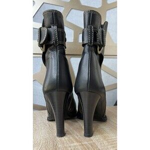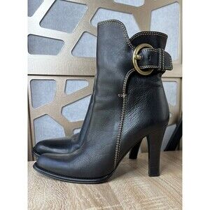 Item Description: Heeled boots (3.5"), Black with gold-tone stiching, buckle detail and zipper closure.