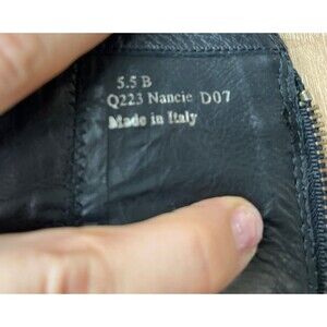 Item Description: Heeled boots (3.5"), Black with gold-tone stiching, buckle detail and zipper closure. Origin: Stamped: Made in Italy Materials: Calf Leather outer boot, fully lined with leather Size: 5.5 Manufacturer: Coach, style "Nancie"
