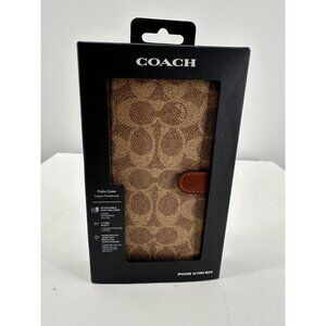 This Coach New York folio wallet case is the perfect accessory for your Apple iPhone 15 Pro Max. It offers a luxurious and premium look with its matte and anti-glare finish, while also providing accessible controls and a card pocket for added convenience. The signature C Tan color and Coach logo add a touch of elegance to the brown canvas and leather material.