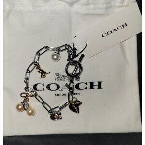 COACH NWT Silver Cherry Dinosaur C Logo Pearl Charm Bracelet