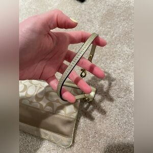 Older style gold and tan oversized wristlet. Has no wear other than the one spot included in the photos. Very cute and matches everything!
