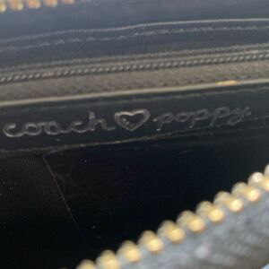 COACH POPPY Black Shiny Leather Zippered Wallet in good condition. Zipper still works but has a ripped portion of about an inch. Please see last two (2) photos. Price offered reflects this issue.