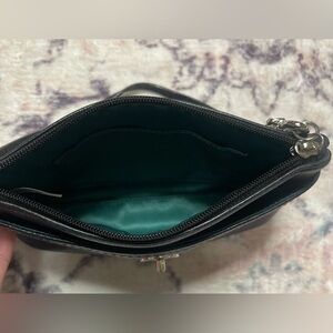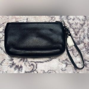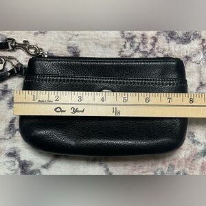 Sleek and stylish classic black leather wristlet, perfect for any occasion. Compact design with a convenient wrist strap for easy carrying.