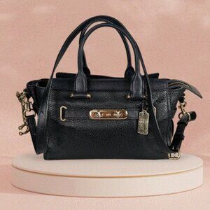 COACH Pebble Leather Swagger 27 Crossbody Handbag Satchel Black, Inside zip, cell phone and multifunction pockets, Zip-top closure, fabric lining, Handles with 4" drop, Longer strap with 19" drop for shoulder wear 10 3/4" (L) x 7 3/4" (H) x 5 3/4" (W) Good condition. SEE ALL THE PICTURES BEFORE BUYING. Pet-free, smoke-free home. Fast shipping.