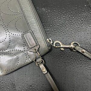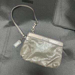 Add a touch of sophistication to your casual look with this Coach Perforated Signature C wristlet purse. The exterior of the purse is made of silver leather with a perforated finish, which gives it a unique and trendy look. The wristlet comes with a silver wrist strap, making it easy to carry around.