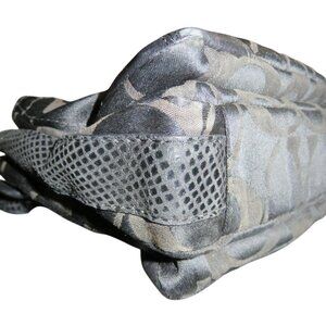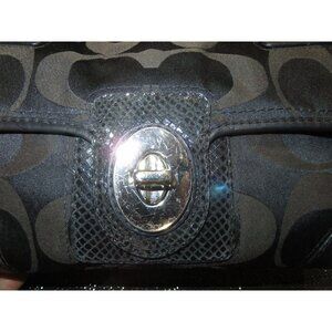 This elegant COACH 2009 Peyton bag features a black snake-embossed leather and signature sateen design, complete with a turnlock flap closure. Perfect for adding a touch of sophistication to any outfit. Ideal for those who appreciate timeless fashion.